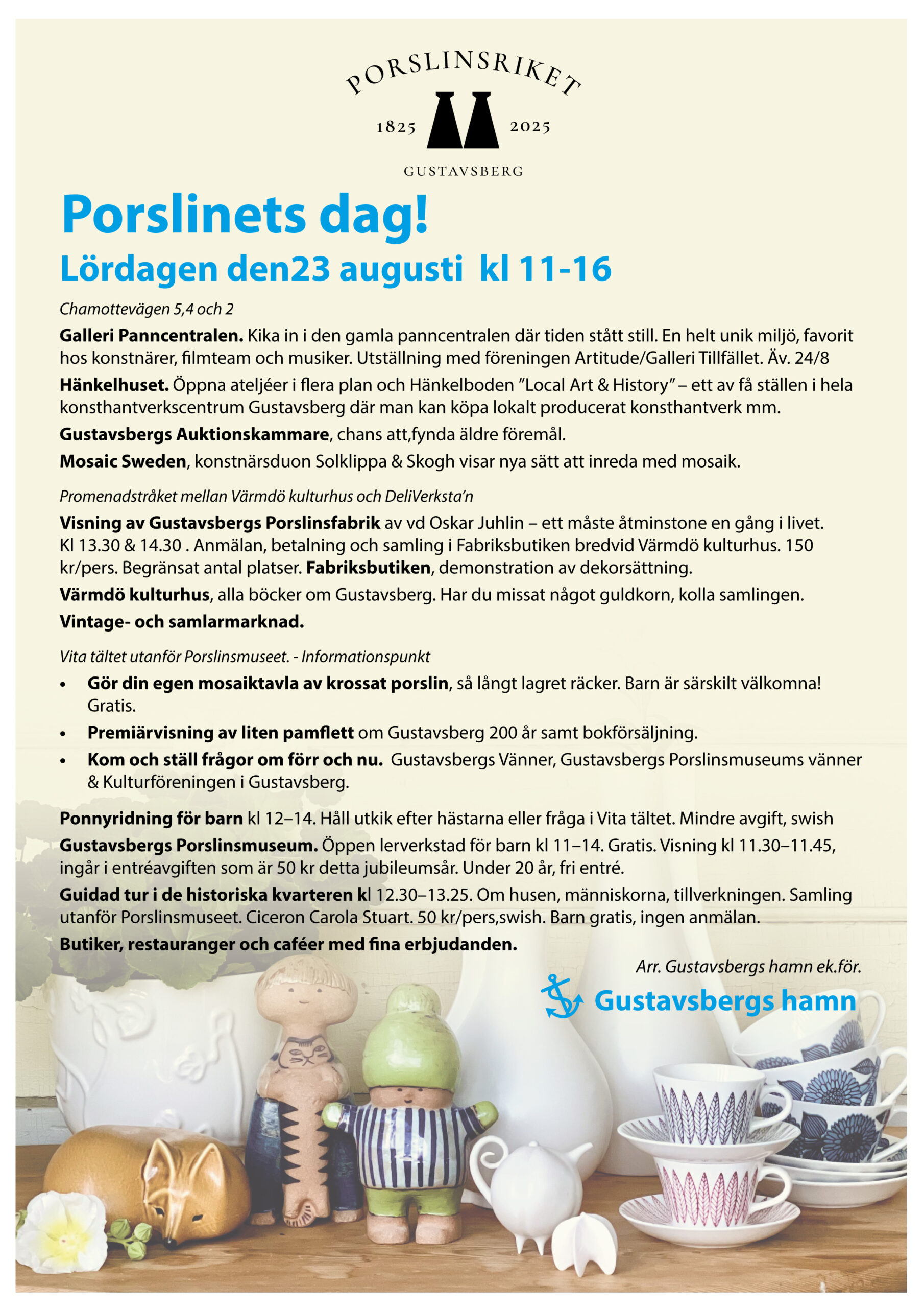 I år hålls detta program åter igen. Missa inte årets höjdpunkt för alla som är intresserade av porslin, keramik, kultur, konsthantverk och levande kulturarv. Vi ses lördagen den 23 augusti 2025.